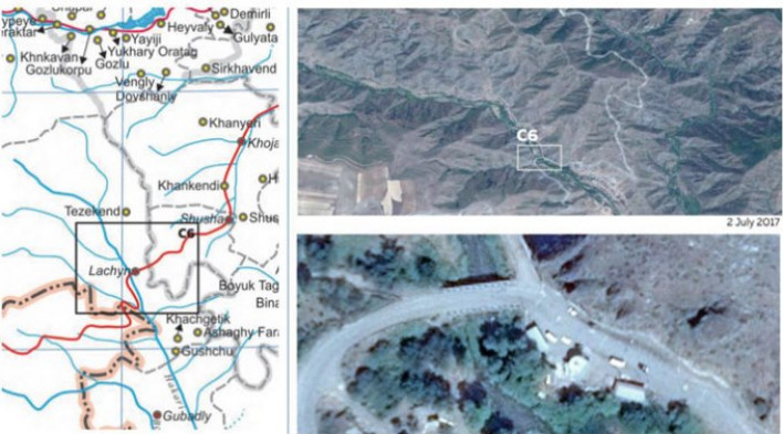 Լուսանկարում Լաչինի հսկիչ անցագրային կետի լուսանկարն է՝ արված Արդբեջանական արբանյակից։» , -գրում է Դերենիկ Մելիքսեթյան:
