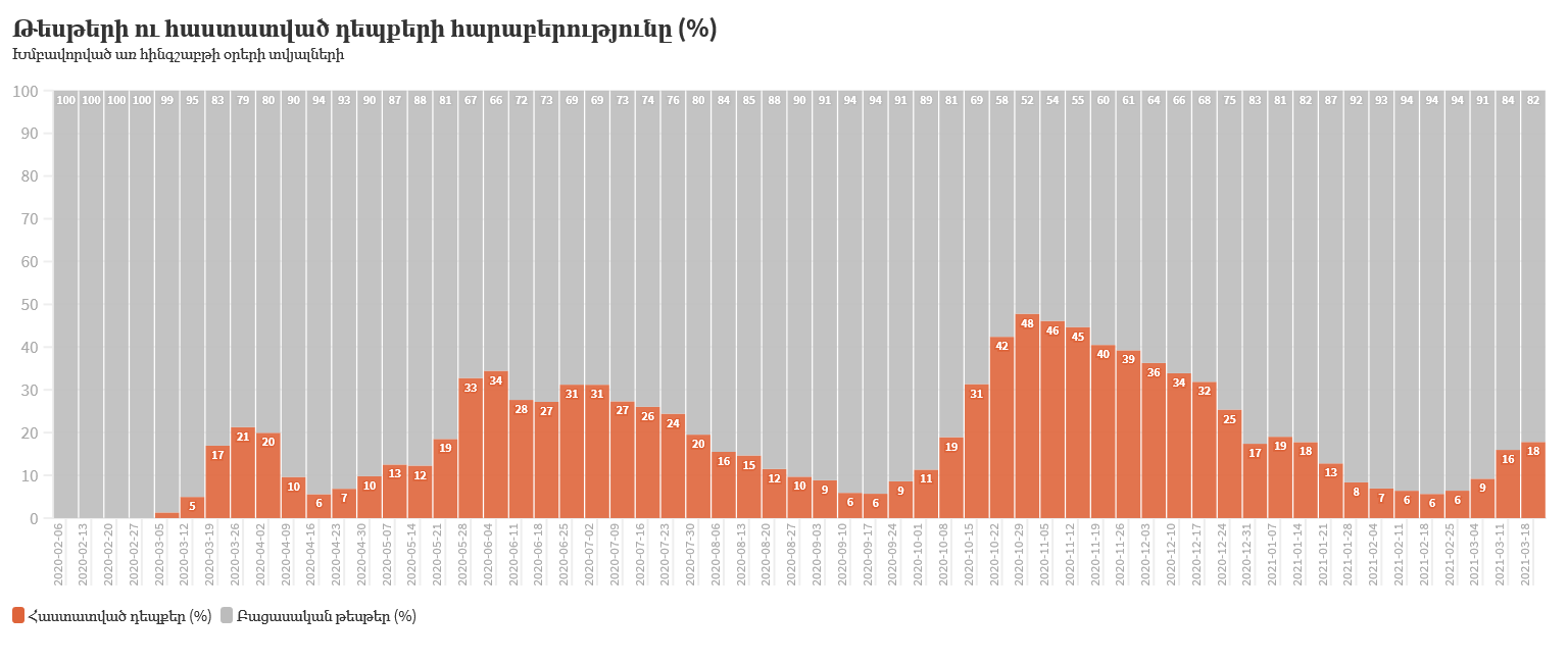 Ինչպես տեղեկացնում է ՀՀ ԱՆ հիվանդությունների վերահսկման և կանխարգելման ազգային կենտրոնը, մեկ օրում կորոնավիրուսի հետևանքով մահացել է 19 քաղաքացի, մահացածների թիվը 3320 է:
