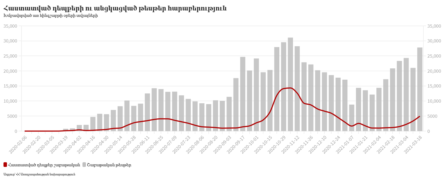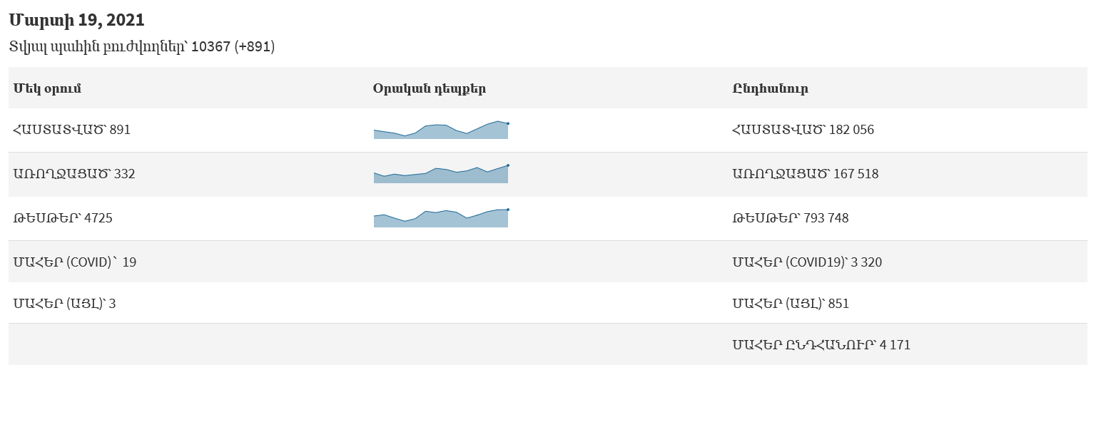 Հայաստանում մարտի 19-ի դրությամբ հաստատվել է կորոնավիրուսով վարակման 891 նոր դեպք, վարակվածների ընդհանուր թիվը հասել է 182 056-ի: