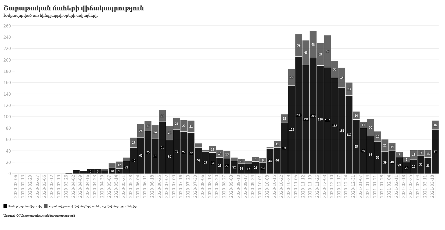 Մեկ օրում գրանցվել է կորոնավիրուսով վարակված պացիենտների՝ այլ հիվանդությունից մահվան 3 դեպք: Մարտի 19-ի դրությամբ մահվան այս դեպքերի թիվը 851 է: Ընդհանուր առմամբ, մեկ օրում մահացել է 22 մարդ, իսկ մահվան ընդհանուր դեպքերի թիվը հասել է 4171-ի: