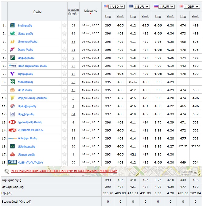ԱՄՆ դոլարի առքի առավելագույն արժեքն է 399 դրամ վաճառքի նվազագույն արժեքը` 405 դրամ։