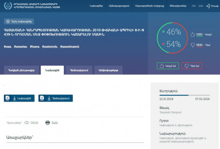 Այս «պատերազմի» արդյունքում նշյալ նախագիծն ունեցել է e-draft.am-ի համար աննախադեպ՝ մոտ 35 հազար դիտում: Որևէ այլ նախագծի հետ նույնիսկ համադրելի չէ նաև քվեարկողների (ավելի քան 7000) ու մեկնաբանողների (մոտ 170) քանակը: Ու չնայած ԿԳՄՍՆ-ն ու ՔՊ-ն շարունակում են հրահանգավորված «լցոնումն» ու քվեարկության իրական պատկերը աղճատելու փորձերը, «դեմ» քվեարկողների քանակը շարունակում է մեծամասնություն կազմել, թեպետ որոշ օրերի մի քանի ժամով «ֆեյքային» քվեարկությունն «արդյունք» էր տվել, և «կողմ» քվեարկողների քանակը հատել էր 50 տոկոսի սահմանագիծը: Երեկվա դրությամբ հարաբերակցությունը 46/54 էր՝ հօգուտ «դեմ» արտահայտվողների: