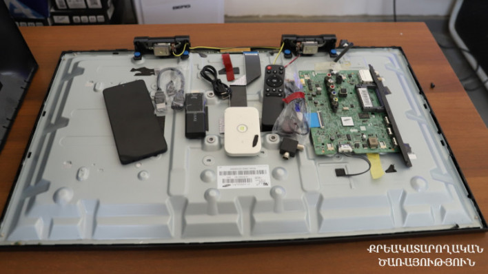 Զննությամբ ծառայողները հեռուստացույցի միջից հայտնաբերել են թաքցված բջջային հեռախոս, wi-fi սարք, TV smart box՝ համացանցին միանալու հնարավորությամբ, և 2 բաժանորդային քարտ։