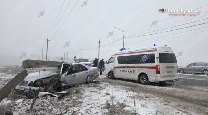 Զովունի-Եղվարդ ավտոճանապարհին «Mercedes»-ը բшխվել է բետոն էլեկտրասյանը, տապшլել այն. բետոնե էլեկտրասյունն ընկել է ավտոմեքենայի վրա. կա վիրшվոր