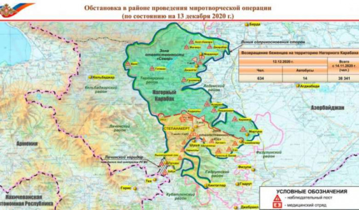 Ռուսաստանի ՊՆ-ն հրապարակել է դեկտեմբերի 13-ի դրությամբ Արցախում իրավիճակի մասին հերթական քարտեզը: