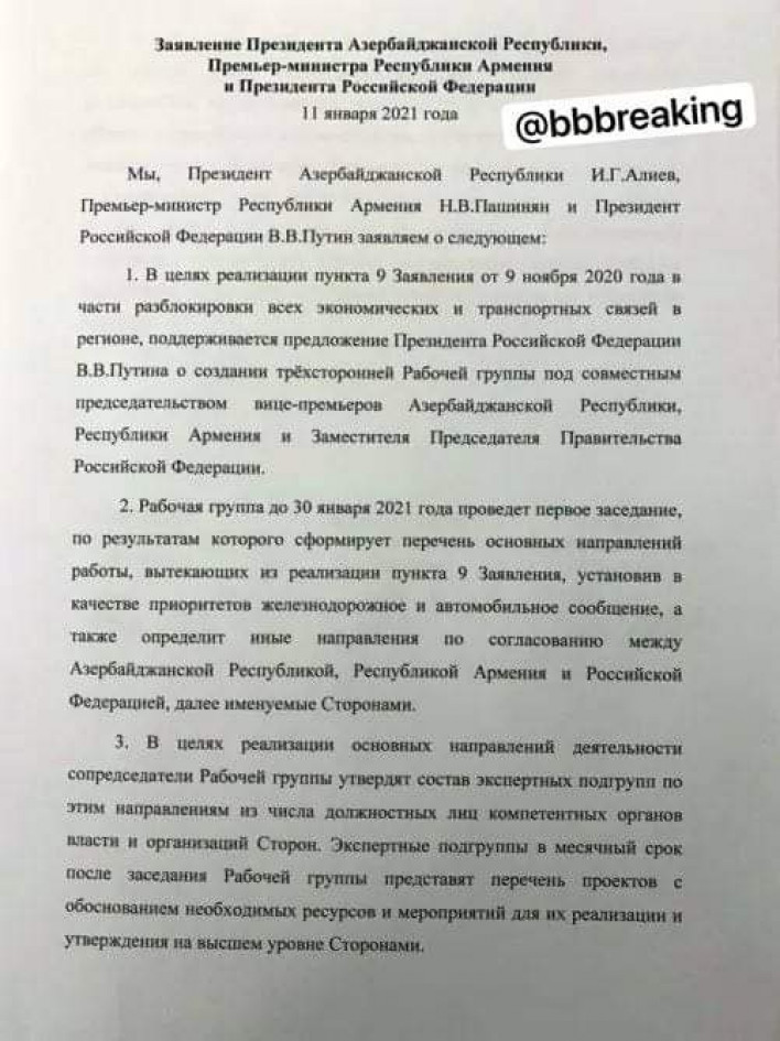 Երեք ղեկավարների ստորագրված համատեղ հայտարարությունը (լուսանկարներ) 20:03 - 11/հունվարի/2021 Поделиться Երեք ղեկավարների ստորագրված համատեղ հայտարարությունը (լուսանկարներ) Միայն մի բան.կապիտուլյանտ Նիկոլը չի կարող պատշաճ ներկայացնել Հայաստանը...