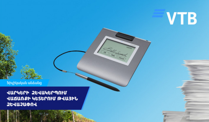 «ՎՏԲ-Հայաստան Բանկն աջակցում է բնական ռեսուրսների պահպանմանն ուղղված ESG-նախաձեռնություններին և ակտիվորեն զարգացնում է «բանկ՝ առանց թղթի» գաղափարը: Մեր փորձագետների կանխատեսումների համաձայն՝ վաճառակետերում ապառիկ վարկեր ձևակերպելիս՝ փաստաթղթերի թվային ստորագրության կիրառումը կխնայի տարեկան ավելի քան 600 հազ․թերթ թուղթ»,- նշում է ՎՏԲ-Հայաստան Բանկի Մանրածախ բիզնեսի զարգացման դեպարտամենտի տնօրեն Տաթևիկ Բադալյանը։