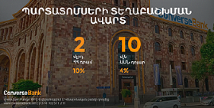 Կոնվերս Բանկը նախանշված ժամկետից շուտ ավարտել է 2 մլրդ ՀՀ դրամ եւ 10 մլն ԱՄՆ դոլար ընդհանուր ծավալով անվանական արժեկտրոնային պարտատոմսերի տեղաբաշխումը:
