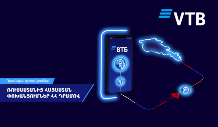ՎՏԲ-ն մեկնարկել է Ռուսաստանից Հայաստան դրամական փոխանցումներ ազգային արժույթով։ Ծառայությունը հասանելի է ստացողի բանկային տվյալների միջոցով: Փոխանցումը մուտքագրվում է ՎՏԲ-Հայաստան Բանկի հաճախորդի հաշվին մեկ աշխատանքային օրվա ընթացքում: