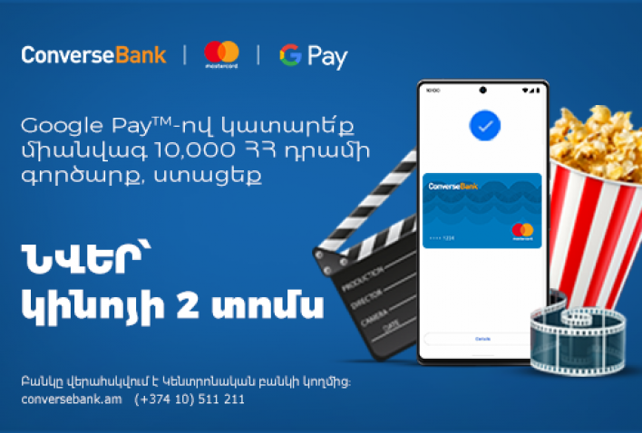 Կոնվերս Բանկի Mastercard քարտապանները հնարավորություն ունեն դիտելու նախընտրած ֆիլմը՝ ընդամենը առօրյա անկանխիկ գնումները կատարելով Google Pay-ին կցված Mastercard-ով: Միանվագ 10.000 ՀՀ դրամ և ավելի գումարի առաջին գործարքի համար հաճախորդը կստանա կինոթատրոնի երկու տոմս: Եթե հաճախորդն ունի մեկից ավելի Mastercard, ապա Google Pay-ին կարող է կցել մեկից ավելի քարտ, կատարել գործարքներ նաև դրանցով և ստանալ ավելի շատ տոմսեր: