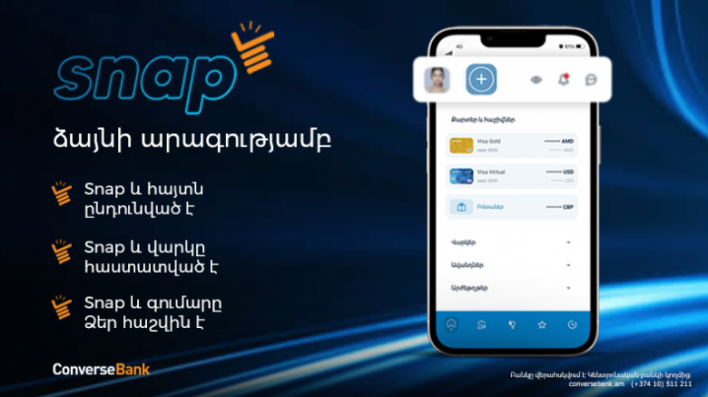 Snap ֆինանսավորումն արդեն հասանելի է Կոնվերս Մոբայլ հավելվածում: Այս պրոդուկտի ներդրմամբ Բանկն ընդլայնում է թվային հարթակներում ֆինանսավորման գործիքակազմը՝ զգալիորեն մեծացնելով ֆինանսական միջոցների հասանելիությունն իր հաճախորդների համար 24/7 ռեժիմով: